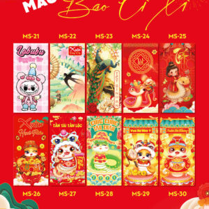 Chúng tôi có sẵn 1 mẫu bao lì xì đẹp mắt, đa dạng phong cách và họa tiết, phù hợp với nhiều sở thích và nhu cầu khác nhau. Mỗi mẫu bao lì xì đều được thiết kế với ý tưởng độc đáo, mang lại may mắn và tài lộc cho người nhận. ( 6 mẫu có sẵn đặt vị trí ép kim (Mã 2,3,4,5,7,12)