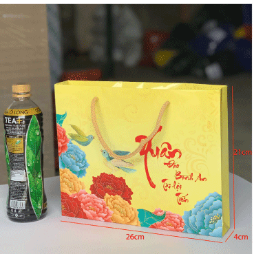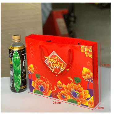 Túi giấy có sẵn đựng lịch để bàn là lựa chọn lý tưởng để bảo vệ và tạo ấn tượng cho sản phẩm quà tặng dịp Tết hoặc các sự kiện tri ân khách hàng. Với thiết kế chuẩn kích thước 21 x 26 x 4 cm, chất liệu giấy Coucher cao cấp 200gsm, sản phẩm giúp đảm bảo độ bền chắc khi vận chuyển lịch để bàn, đồng thời mang lại sự tinh tế và chuyên nghiệp.