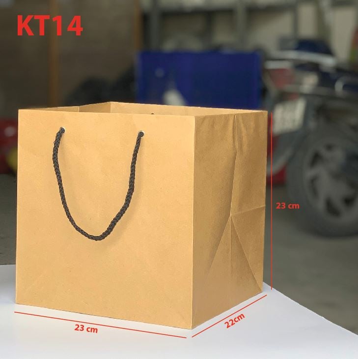 Túi giấy có sẵn KT14 với thiết kế vuông độc đáo là lựa chọn lý tưởng cho các shop quà tặng, mỹ phẩm, phụ kiện và cửa hàng thời trang. Sở hữu kích thước 23 x 23 x 22 cm, được làm từ giấy Kraft nâu 160gsm bền chắc, quai dù tròn tiện lợi, túi có thể chịu lực từ 3–5kg, phù hợp để đựng nhiều loại sản phẩm như mỹ phẩm, quần áo, giày dép hoặc quà tặng.